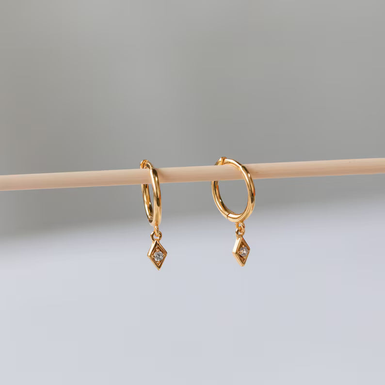 Add some geometric spice to your earring stack with our Dangling Huggie Hoops. The diamond shaped dangling earring charm sparkles with a diamond stone nestled perfectly inside. Elegant and easy to wear, these earrings will fit into any ensemble.